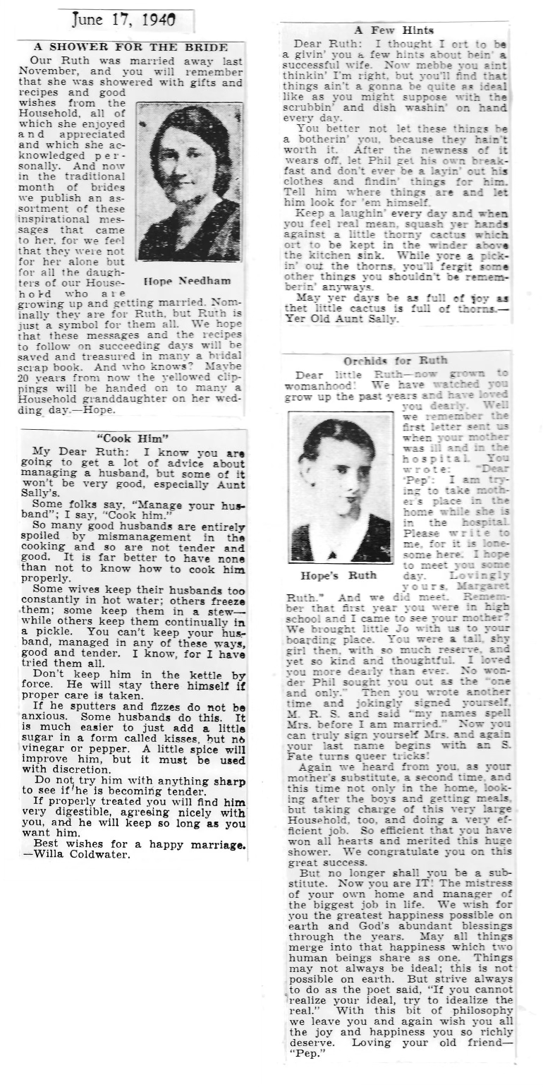 Hope at the Helm[1940-06-17] A Shower for the BrideHope NeedhamJun 17, 1995ShareHope at the Helm[Below this line is a transcription of the article written by Hope Needham which is displayed above.]PreviousNext